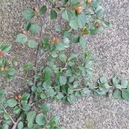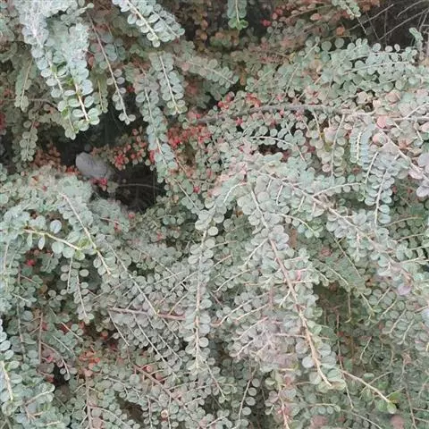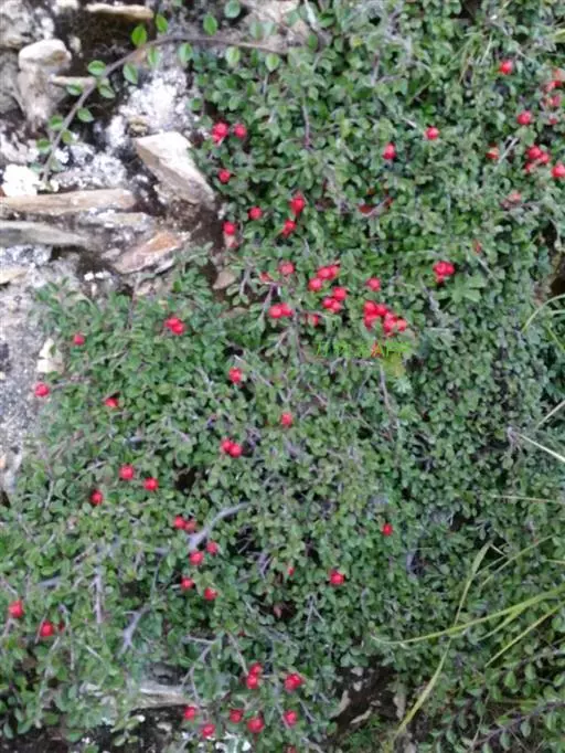 匍匐栒子 匍匐栒子是落叶匍匐灌木,茎不规则分枝,平铺地上;小枝细瘦,圆柱形,幼嫩时具糙伏毛,逐渐脱落,红褐色至暗灰色。叶片宽卵形或倒卵形,稀椭圆形,长5-15毫米,宽4-10毫米,先端圆钝或稍急尖,基部楔形,边缘全缘而呈波状,上面无毛,下面具稀疏短柔毛或无毛;叶柄长1-2毫米,无毛;托叶钻形,成长时脱落。