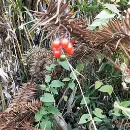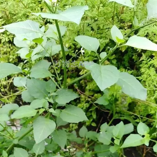龙葵(学名:Solanum nigrum L. ):一年生草本植物,全草高30-120厘米;茎直立,多分枝;卵形或心型叶子互生,近全缘;夏季开白色小花,4-10朵成聚伞花序;球形浆果,成熟后为黑紫色。浆果和叶子均可食用,但叶子含有大量生物碱,须经煮熟后方可解毒。全株入药,可散瘀消肿,清热解毒。