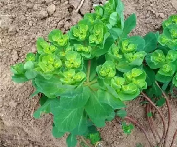 一年生或二年生草本,高10~750px,全株含乳汁。茎基部分枝,带紫红色。叶互生,倒卵形或匙形,长1~75px,宽0.7~25px,先端微凹,边缘中部以上有细锯齿,无柄。茎顶有5片轮生的叶状苞;总花序多歧聚伞状,顶生,有5伞梗,每伞梗生3个小伞梗,每小伞梗又第3回分为2叉; 杯状聚伞花序钟形,总苞顶端4裂,裂间腺体4,肾形;子房3室,花柱3。蒴果无毛。种子卵形,表面在凸起的网纹。花期4~5月,果期6~7月。生于沟边、路旁、田野。分布于除新疆、西藏以外的全国各省区。