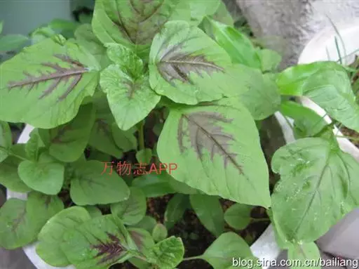 叶片边缘绿色,叶脉附近紫红色,耐热性较差, 质地软。有上海的尖叶红米苋及广州的尖叶花红等。