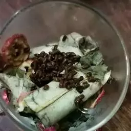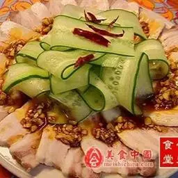 吃法:取适量烤鸭肉片、黄瓜丝、葱丝夹入薄饼皮中,卷成棒状,在其外蘸上甜面酱 。