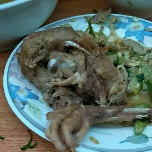 (2)将鸭体翻过来,放在煺下的鸭毛上,再用左手按住鸭体。用右手将鸭背、鸭尾尖的毛煺下。然后,把鸭颈、鸭头的毛煺下。