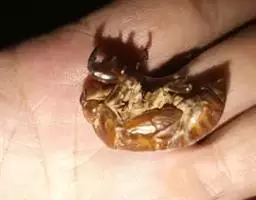(5)将右手的大拇指和食指从鸭膀下的刀口伸进去。拉出食管及气管头。再把拉出的食管缠绕在左手食指上,拉紧。同时,右手的大拇指和食指伸入鸭腔,从上至下勾断鸭腔与内脏连接的软组织,再勾住鸭胗,左手与右手同时用力,拉出内脏。右食指和中指再伸入鸭腔内。在贴进脊椎的两侧。取出肺叶。