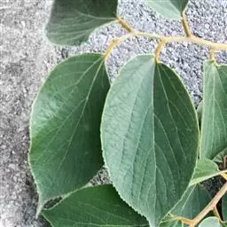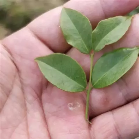 叶具3小叶,长可达14厘米;托叶卵状披针形,急尖,被黄色柔毛。顶生小叶卵圆形或卵状披针形,长3.5-6厘米,宽1.5-2.5厘米,先端锐尖至钝圆,基部近圆形,全缘,两面均被绢状的糙伏毛,侧生小叶斜卵状披针形。