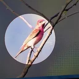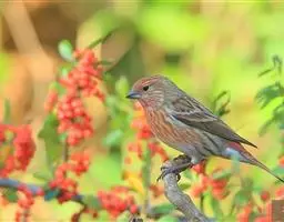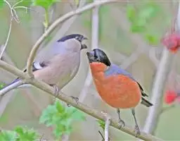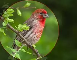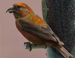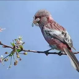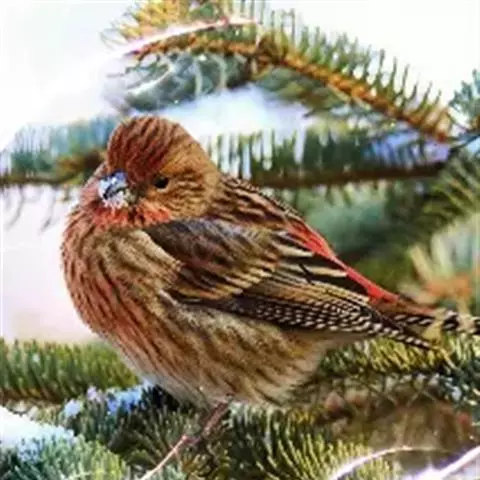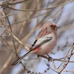 红腰朱雀:体长12-14厘米,小型鸟类。雄鸟前额和眉纹玫瑰粉红色,头顶和一宽的贯眼带深红褐色,背红…