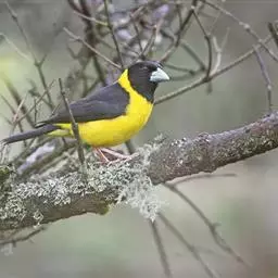 黄颈拟蜡嘴雀:小型鸟类,体长20-22厘米。嘴粗大,黑色。雄鸟整个头、颈、颏、喉和上胸辉黑色,…