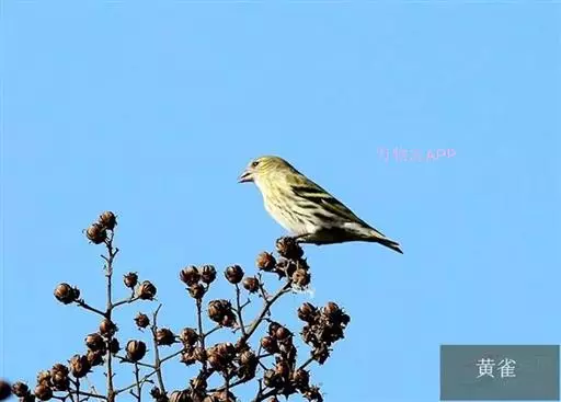 黄雀(学名:Spinus spinus):为雀科金翅雀属的鸟类。体重9.5-16克;体长106-122毫米。雄鸟头顶与颏黑色,上体黄绿色,腰黄色,两翅和尾黑色,翼斑和尾基两侧鲜黄色;雌鸟头顶与颏无黑色,具浓重的灰绿色斑纹;上体赤绿色具暗色纵纹,下体暗淡黄,有浅黑色斑纹;雄鸟飞翔时可显示出鲜黄的翼斑、腰和尾基两侧。虹膜近黑色;嘴暗褐色,下嘴较淡;腿和脚暗褐色。