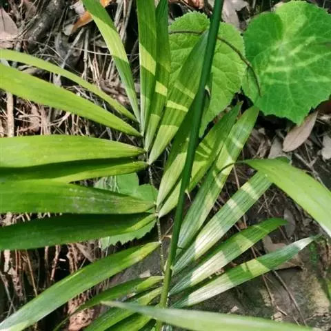 显微鉴别根茎横切面:木柱层为多列扁平木柱细胞。皮层散列多数叶迹维管束;内皮层明显,可见凯氏带。中柱占根茎的大部分,散列多数外韧型维管束,近中往鞘处维管束形小,排列较紧密,木质部内侧或周围有非木化的纤维束。该品薄壁组织中散有油细胞。薄壁细胞含淀粉粒。