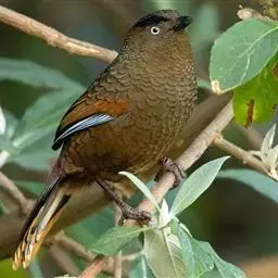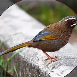 玉山噪鹛中等体型的褐色鸟类。白色长眉纹及髭纹显著;顶冠灰而具白色的鳞状斑纹;脸侧及颏褐色,…