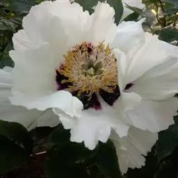 花单生枝顶,紫色,绣球型,有时呈蔷薇型。花径18厘米×6厘米。顶端呈不规则的波状;花蕾扁圆形;花瓣质地薄软皱卷。瓣基具深紫红色晕;雄蕊部分瓣化;雌蕊退化变小。中花品种。花梗细长而软,侧开,花梗长4-6厘米;苞片5,长椭圆形,大小不等;萼片5,绿色,宽卵形,大小不等;雄蕊长1-1.7厘米,花丝紫红色、粉红色,上部白色,长约1.3厘米,花药长圆形,长4毫米;花盘革质,杯状,紫红色,顶端有数个锐齿或裂片,完全包住心皮,在心皮成熟时开裂;心皮5,稀更多,密生柔毛。蓇葖长圆形,密生黄褐色硬毛。花期5月;果期6月。