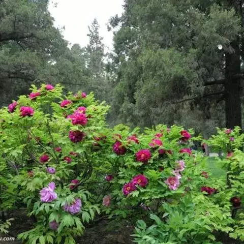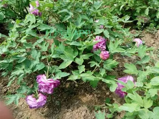 葛巾紫(学名:Paeonia suffruticosa ‘Gejin Zi’):落叶灌木。茎高,分枝短。叶通常为二回三出复叶,顶生小叶宽卵形,表面绿色,无毛,背面淡绿色,有时具白粉,沿叶脉疏生短柔毛或近无毛。花单生枝顶,苞片5,长椭圆形,大小不等;萼片5,绿色,宽卵形,大小不等;花瓣为重瓣,颜色紫色,绣球型,顶端呈不规则的波状;花丝上部白色,花药长圆形,花盘革质,杯状,紫红色;心皮5,密生柔毛。蓇葖长圆形,密生黄褐色硬毛。花期5月;果期6月。