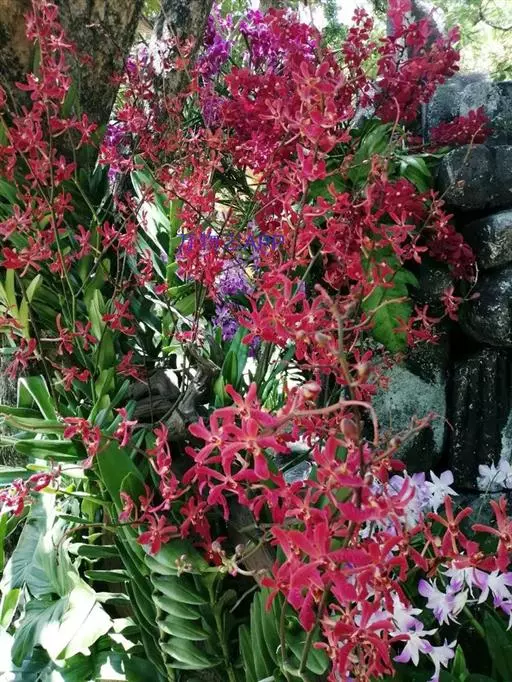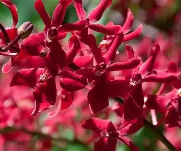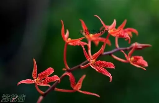 火焰兰(学名:Renanthera coccinea Lour.):茎攀援,粗壮,质地坚硬,圆柱形,长1米以上,粗约1.5厘米,通常不分枝。叶二列,斜立或近水平伸展,舌形或长圆形。花序与叶对生,常3-4个,粗壮而坚硬,圆锥花序或总状花序疏生多数花;花火红色,开展;花瓣相似于中萼片而较小,先端近圆形,边缘内侧具桔黄色斑点;唇瓣3裂。花期4-6月。