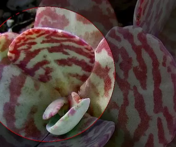 为多年生肉质植物,植株呈灌木状,通常在基部分枝,茎圆柱形,直立生长。肉质叶交互对生,无柄,叶片倒卵形,叶缘有不规则的波状齿,长约10厘米,蓝灰至灰绿色,被有一层薄薄的白粉,表面有红褐至紫褐色斑点或晕纹。