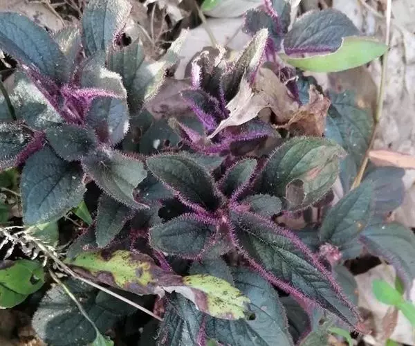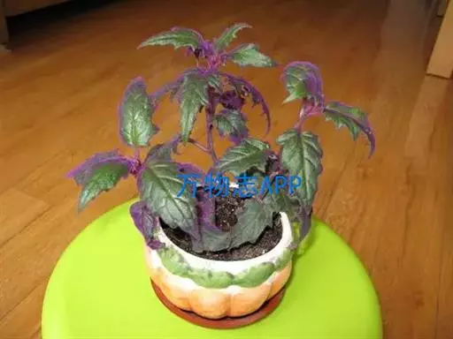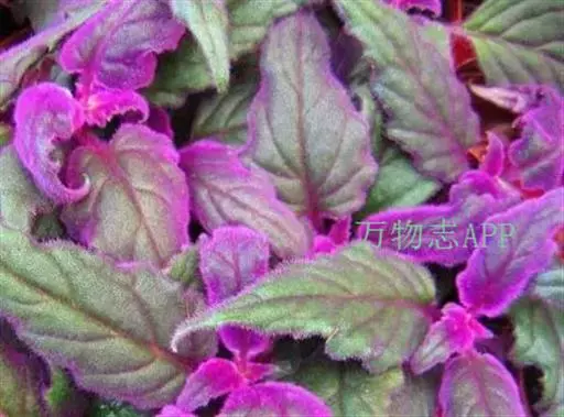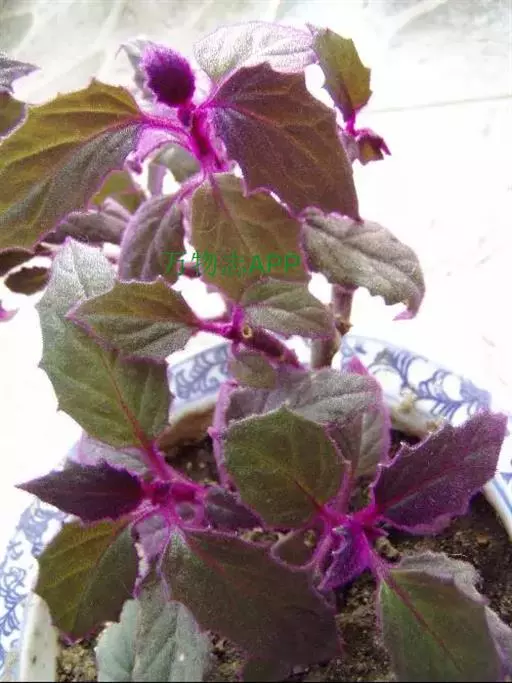 常绿多年生草本植物,多分枝,蔓生状。茎多汁,幼时直立,长大后下垂或匍匐蔓生。茎叶密被紫红色绒毛。叶对生,卵形或广椭圆形,叶长8~15厘米,宽4-5厘米;叶缘有较粗的复锯齿,叶端急尖,叶脉掌状明显。幼叶呈紫红色,长大后呈深绿色,整个植株密被紫红色的茸毛。在观叶植物中很有特色。