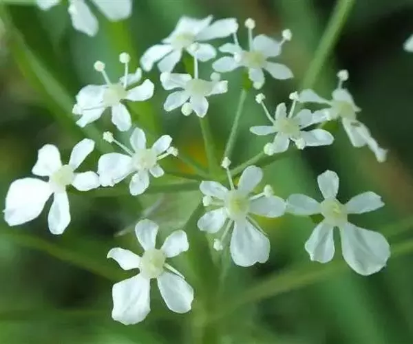 复伞形花序直径2.5-8厘米,伞辐4-15。不等长;小总苞片5-8,卵形至披针形,顶端尖锐,反折,边缘有睫毛或近无毛;花白色,通常带绿或黄色;花柱较花柱基长2倍。