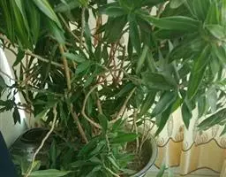 叶长披针形,似竹子;叶互生或近对生,纸质,叶长披针形,有明显3-7条主脉,具短柄,叶片浓绿色。叶长13-23厘米,宽1.8-3.2厘米,边缘白色或黄白色,叶柄长7.5-10厘米。