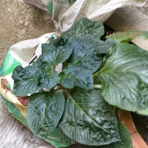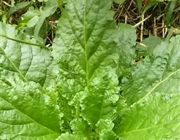 基生叶倒卵形或宽倒卵形,长20-30厘米,坚实,深绿色,有光泽,基部渐狭成宽柄。全缘或有不显明圆齿或波状齿。中脉白色。宽达1.5厘米,有多条纵脉;叶柄长3-5厘米,有或无窄边;下部茎生叶和基生叶相似,基部渐狭成叶柄;上部茎生叶倒卵形或椭圆形,长3-7厘米,宽1-3.5厘米,基部抱茎,宽展,两侧有垂耳,全缘,微带粉霜。