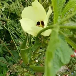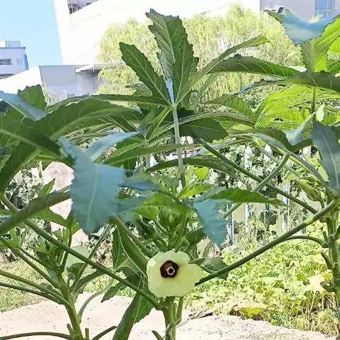 咖啡黄葵(学名:Abelmoschus esculentus (Linn.)Moench)亦称黄秋葵,锦葵科一年生草本植物。茎圆柱形,疏生散刺。叶掌状,裂片阔至狭,托叶线形,被疏硬毛。花单生于叶腋间,花梗疏被糙硬毛,小苞片钟形;花萼钟形,密被星状短绒毛;花黄色,内面基部紫色,蒴果筒状尖塔形,种子球形,具毛脉纹。花期5-9月。