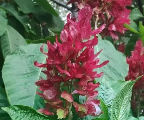 赤苞花Megaskepasma erythrochlamys Lindau又称巴西红斗篷、巴西羽毛、 红爵床、爵床胭脂,为爵床科赤苞花属常绿半木质化灌木,原产于萨尔瓦多、洪都拉斯、尼加拉瓜、哥斯达黎加、巴拿马、苏里南和委内瑞拉的多雨的森林地带,国内在西双版纳植物园、厦门植物园、华南植物园等地有少量引种栽培。
