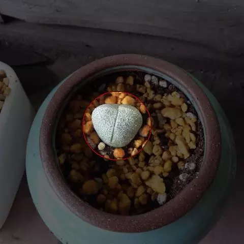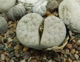 荒玉为番杏科生石花属,原产南非。株体呈白粉色,表面布满凹凸纹路,凹陷处为红褐色,每年秋季开黄花。