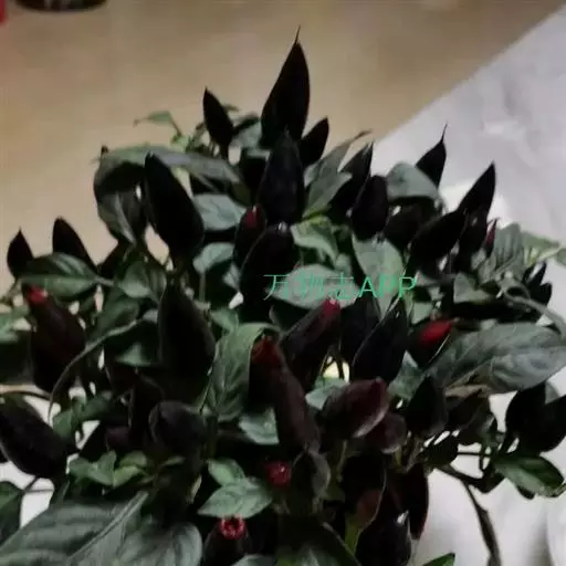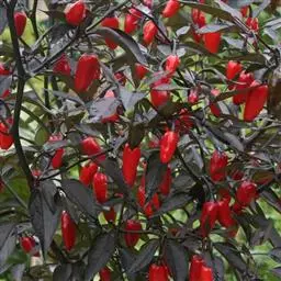 黑弹头辣椒为观赏椒品种。株高60厘米。叶深绿色,茎枝紫色,开紫花。果对生或簇生,呈小圆锥形,形似“子弹头”,味极辣。果长3厘米,果肩直径1.6厘米,果柄长2.5厘米。幼果黑色,成熟果鲜红色。坐果率高,每株可坐果100多个。在盛果期,椒果黑红朝天,如待发的密林防空弹头,颇为壮观。