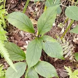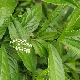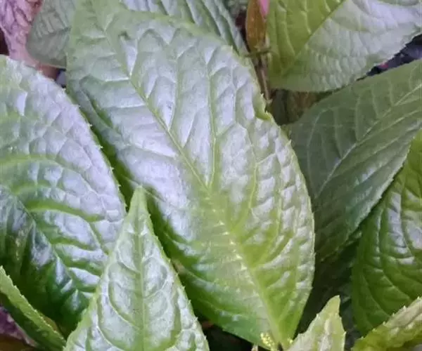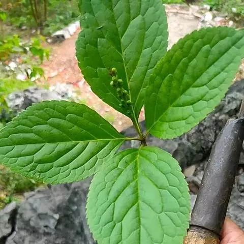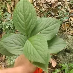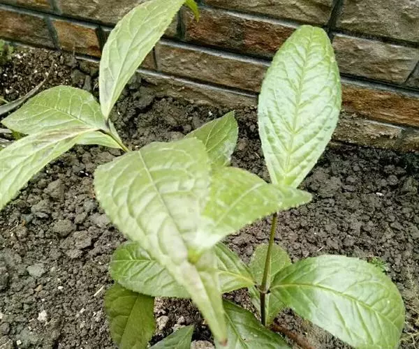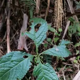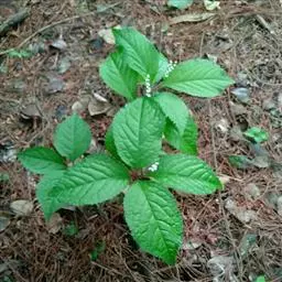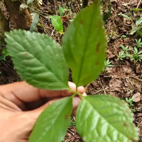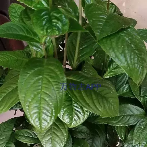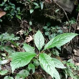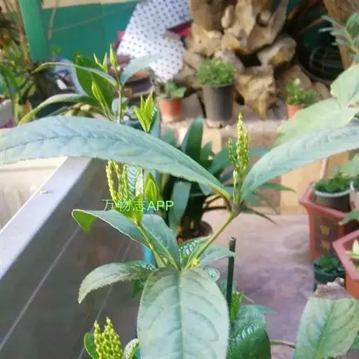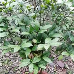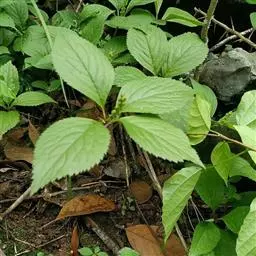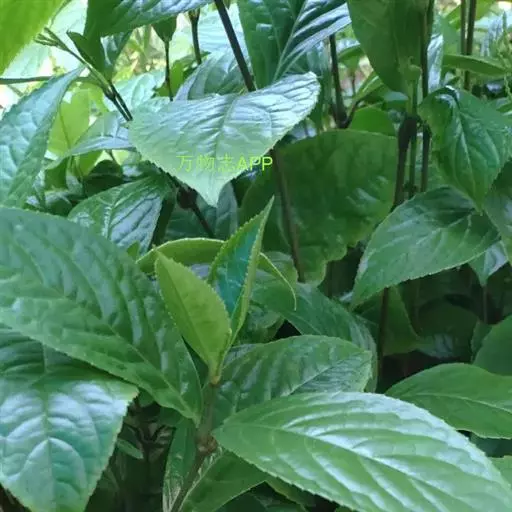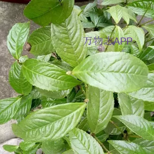 半灌木,直立或稍平卧,高30-60厘米;茎圆柱形,无毛。叶对生,厚纸质,椭圆形或倒卵状椭圆形,长5-11厘米,宽2.5-5.5厘米,顶端急尖或钝,基部楔形,边缘具圆齿状锯齿,齿端有一腺体,腹面深绿色,光亮,背面淡黄绿色,侧脉6-8对,两面稍凸起;叶柄长8-18毫米,基部多少合生;托叶微小。