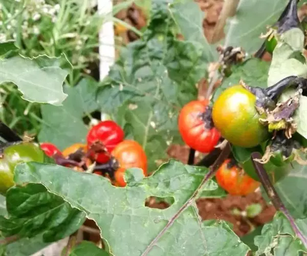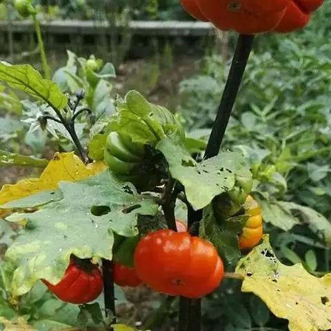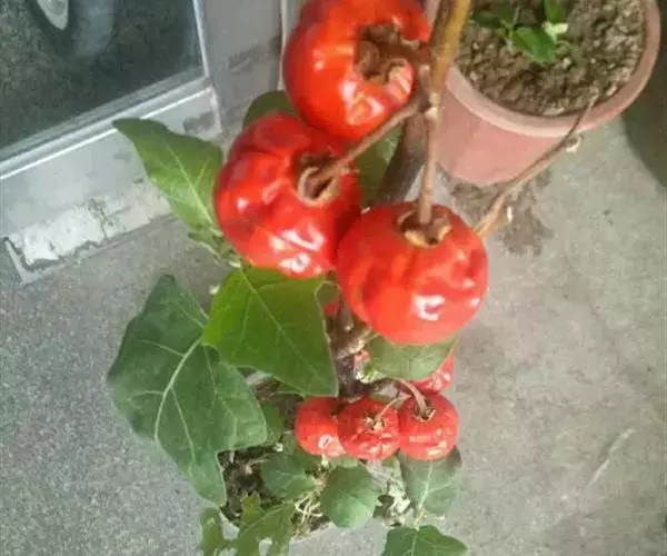 红茄(Solanum integrifolium Poir.),是茄属一年生草本,高约0.7米,茎,叶下面,叶柄及花梗均被5-9分枝有柄或无柄的星状绒毛,小枝黑褐色,毛被初时较密,以后逐渐脱落,具疏稀的浅黄色皮刺,皮刺先端深黄褐色。上部叶常假双生,不相等,叶片卵形至长圆状卵形,先端三角形,渐尖或钝,基部不相等,边缘作不规则的波状深裂,裂片三角形;叶柄长约2-7厘米,具有与中脉相似的皮刺。花序腋外生;花冠白色,略带紫晕,星形或近星状辐形,内面及外面均被星状绒羌,花冠筒长不到1毫米;花丝长约0.6-1毫米,无毛,花药披针状椭圆形;子房近圆球形。浆果橙黄色或猩红色,圆形,顶基压扁,每棱上又往往有1浅沟。种子肾形,淡黄色,直径2-3.5毫米。