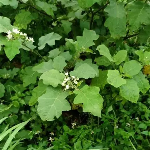 一年生草本,高约0.7米,茎,叶下面,叶柄及花梗均被5-9分枝有柄或无柄的星状绒毛,小枝黑褐色,毛被初时较密,以后逐渐脱落,具疏稀的浅黄色皮刺,皮刺先端深黄褐色,锐尖,基部淡黄色,宽扁,直或微弯,长2-5毫米,基部宽约1-2毫米。上部叶常假双生,不相等,叶片卵形至长圆状卵形,长10-20厘米,宽6-14厘米,先端三角形,渐尖或钝,基部不相等,边缘作不规则的波状深裂,裂片三角形,上面疏被单毛及4-(8)分枝较短的星状绒毛,下面苍白色,常亮绿或暗绿,密被5-9分枝较长的淡黄色或灰绿色星状绒毛,以7-9分枝的较多;中脉在两面均被较密的星状毛及稀疏的钻形直刺,很少有不具的,刺长约3-7毫米,基部稍宽扁,侧脉每边4-7条,很少具有细皮刺;叶柄长约2-7厘米,具有与中脉相似的皮刺。