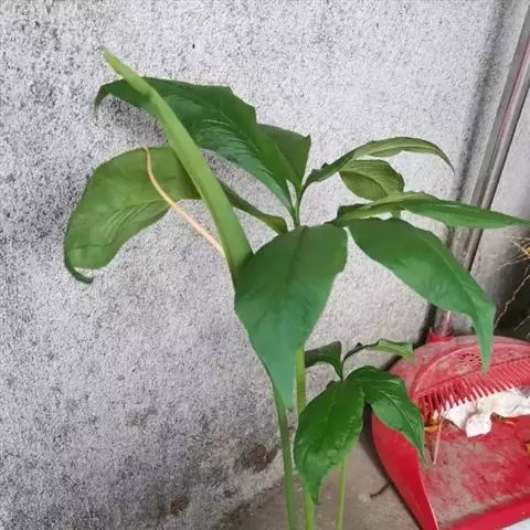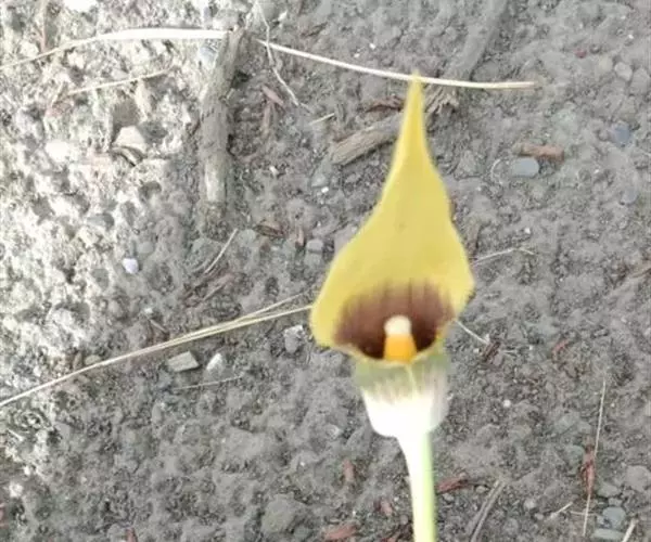 花序柄常先叶出现,长于叶柄,长15-30厘米,绿色。佛焰苞为本属中最小的,长2.5-6厦米,管部卵圆形或球形,长1-1.5厘米,直径1-1.4厘米,黄绿色,喉部略缢缩,上部通常深紫色,具纵条纹;檐部长圆状卵形,长1.5-4.5厘米,宽0.8-2厘米,先端渐狭至锐尖,黄色或绿色,内面至少在下部为暗紫色,略下弯。
