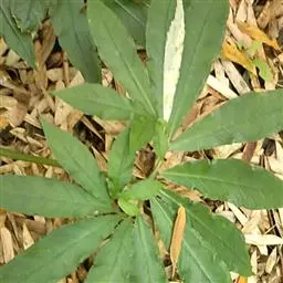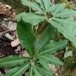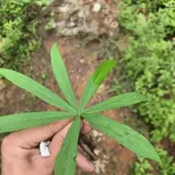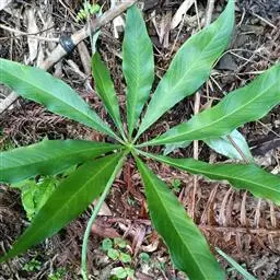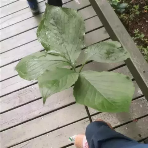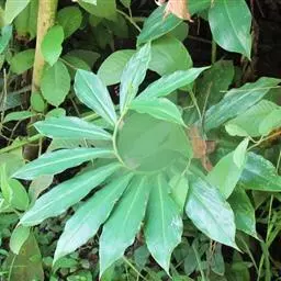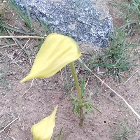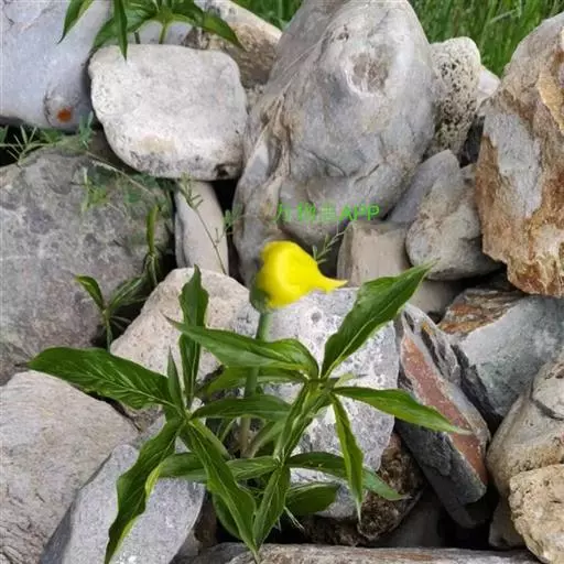 黄苞南星 块茎近球形,小,直径1.5-2.5厘米。鳞叶3-5,锐尖,内面的长8-25厘米。叶2-1,叶柄长12-27厘米,具鞘部分占4/5;叶片鸟足状分裂,裂片5-11(-15),芽时中裂片向上,余向下,长圆披针形或倒卵状长圆形,先端渐尖,基部楔形,长2.5-12厘米,宽0.6-3厘米,亮绿色,侧脉与中肋成锐角上升,细弱,常不连接为整合的集合脉。