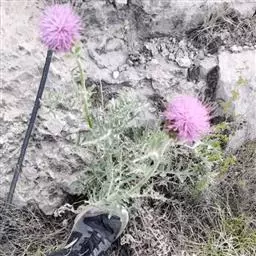 头状花序单生茎枝顶端,植株通常有6-10个头状花序,但不形成明显的花序式排列。苞叶绿色,长3-4厘米,针刺状羽状全裂。总苞大,宽钟状,直径3-4厘米。总苞片9-10层,覆瓦状排列;外层及中外层长卵形或三角形,长6-8毫米;中层披针形或椭圆状披针形,长11-16毫米;最内层宽线形,长2厘米,顶端紫红色。全部苞片顶端钝,边缘有白色蛛丝毛。小花长1.7厘米,紫红色,冠檐5深裂。