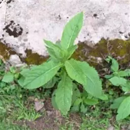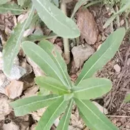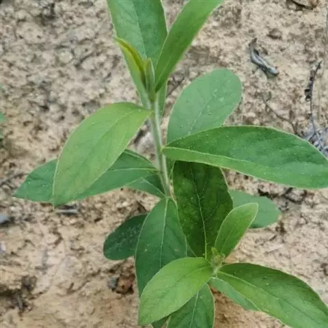叶对生,下缘具疏锯齿。茎圆形,无毛直立,二歧分叉,分叉点处抽生花梗。