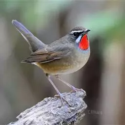 红尾歌鸲:体长13-15厘米。上体橄榄褐色。尾羽棕栗色,眼先和颊黄褐色,眼周淡黄褐色。…