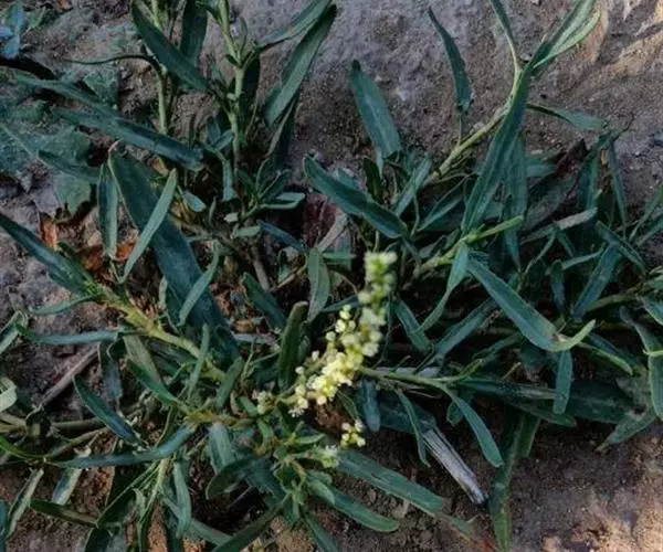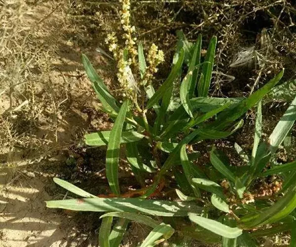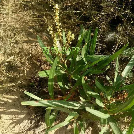 多年生草本,高6-20cm。有细长的根茎。茎斜上或近直立,通常自基部分枝。叶互生,有短柄;叶片稍肥厚,近肉质,披针形或长椭圆形,无毛,长5-8cm,宽5-15mm,先端急尖或钝,基部戟形或楔形。花序圆锥状,顶生,长3-5cm;苞片漏斗状;花梗中上部有关节;花黄绿色,有短梗;花被5深裂,裂片长圆形,长约3mm;雄蕊7-8;花柱3,甚短,柱头头状。瘦果椭圆形,有3棱,黑色,平滑,有光泽。花、果期秋季。