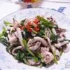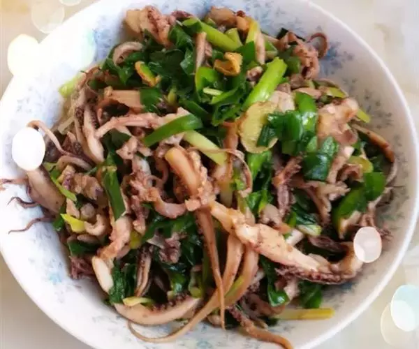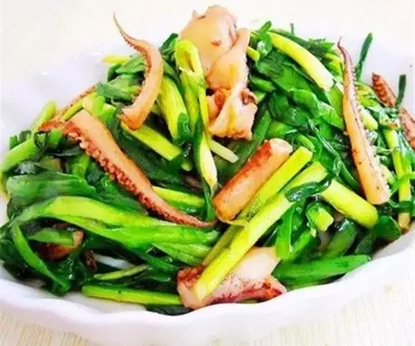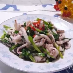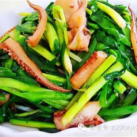 11. 放入韭菜翻炒1分钟后,将鱿鱼倒入再炒30秒;