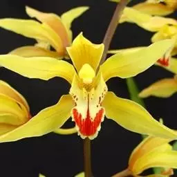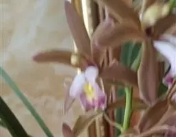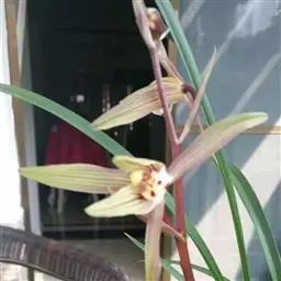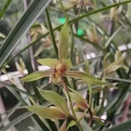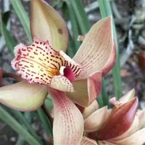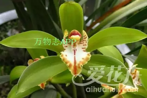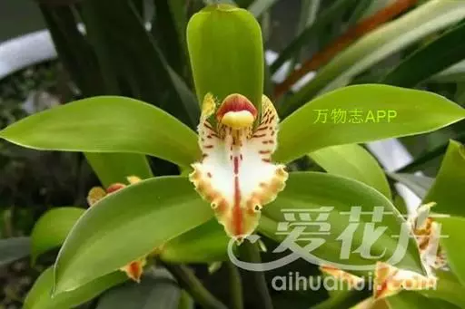斑舌兰(学名:Cymbidium tigrinum Parish ex Hook.):附生植物;假鳞茎近球形或卵球形,强烈压扁,呈双凸镜状,裸露,不为叶鞘所包。叶通常2-4枚,生于假鳞茎顶端,狭椭圆形。花葶发自假鳞茎基部,长10-20厘米,斜展;总状花序具2-5朵花;花稍有香气;萼片与花瓣黄绿色,略有红褐色晕,基部有紫褐色斑点,唇瓣白色,授粉后变为粉红色;花瓣略短于萼片;唇瓣近倒卵形,3裂。花期3-7月。