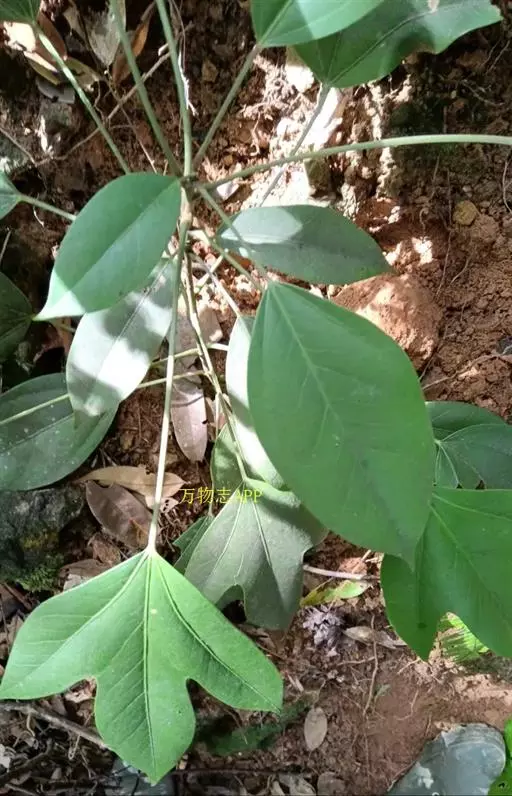 乔木或灌木,高2-8米。叶片厚纸质或革质,密生粗大半透明红棕色腺点(在较薄的叶片才可以见到),叶形变异很大,不分裂叶片通常为椭圆形,稀长圆状椭圆形、椭圆状披针形、披针形或线状披针形,长7-10厘米,宽1.5-4.5厘米,有时更大,先端渐尖,基部钝形或楔形,分裂叶片倒三角形,掌状2-3深裂或浅裂,稀5裂,两面均无毛,边缘全缘,或近先端处有不明显细齿一至数个,或有明显疏离的牙齿,基脉三出,侧脉4-6对,网脉两面显著且隆起,有时上面稍下陷,有时下面较不明显;叶柄长0.5-5厘米,无毛。