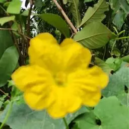 雌雄同株,雌、雄花均单生。雄花:花梗细,比叶柄稍长,花梗、花萼、花冠均被微柔毛;花萼筒漏斗状,长约2厘米,裂片披针形,长5毫米;花冠黄色,裂片皱波状,长3-4厘米,宽2-3厘米,先端微缺而顶端有小尖头,5脉;雄蕊3,花丝长3-4毫米,花药长8-10毫米,长圆形,药室折曲。雌花花梗比叶柄稍短或近等长;花萼和花冠似雄花;花萼筒长2-3毫米;子房中间缢细,密生粘质长柔毛,花柱粗短,柱头3,膨大,2裂。果实初为绿色,后变白色至带黄色。