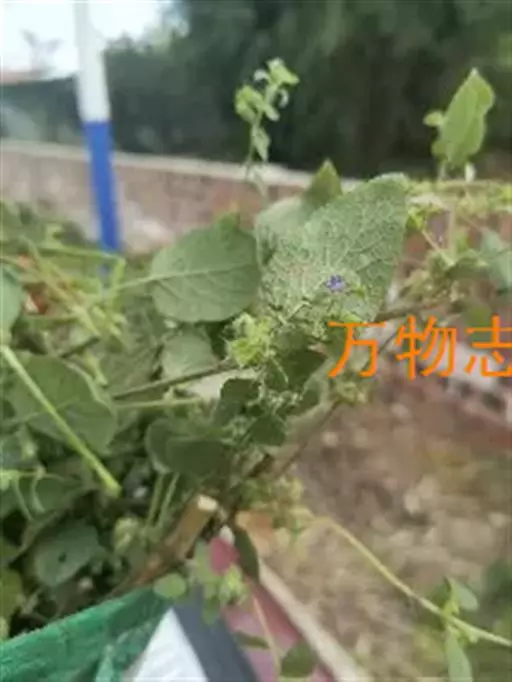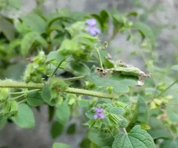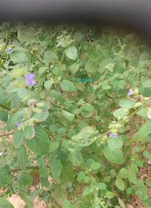 一年生、直立、粗壮、多分枝草本,揉之有香气。茎高60-160厘米,钝四稜形,具四槽,被平展刚毛。叶卵形至宽卵形,长1.4-11厘米,宽1.2-9厘米,生于花枝上的较小,先端近锐尖至钝形,基部圆形或浅心形,常稍偏斜,边缘为不规则的波状,具小锯齿,薄纸质,上面榄绿色,下面较淡,两面均被疏柔毛;叶柄柔弱,长0.5-6厘米,腹凹背凸,毛被同茎。聚伞花序2-5花,有些为单花,着生于渐变小叶腋内,成总状花序或圆锥花序排列于枝上。花萼花时长约5毫米,宽约3毫米,但很快的长大而长达12毫米,宽至6.5毫米,10条脉极凸出,外被长柔毛及淡黄色腺点,内部有柔毛簇,萼齿5,短三角形,先端长锥尖,长约1.5-2毫米,直伸。花冠蓝色,长6-8毫米,外面除冠筒下部外被微柔毛,冠筒基部宽约1毫米,至喉部略宽,宽约2毫米,冠檐二唇形,上唇先端2圆裂,裂片外反,下唇3裂,侧裂片与上唇裂片相似,中裂片囊状,略短。雄蕊4,下倾,插生于花冠喉部,花丝扁平,被疏柔毛,花药汇合成1室。花柱先端2浅裂。花盘阔环状,边缘微有起伏。子房裂片长圆形,无毛。小坚果常2枚成熟,扁平,长约4毫米,宽约3毫米,暗褐色,具细点,基部具二着生点。花、果期一年四季。