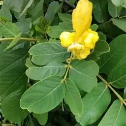 1、香槐又名:黄槐。落叶乔木,高4-10m。树皮灰褐色;散布圆形皮孔。叶互生,奇数羽状复叶;小叶7-11片,小叶柄5-8mm;叶片卵状椭圆形、卵状长椭圆形或长椭圆形,长5-11cm,宽2.5-4cm,先端短渐尖或骤尖,基部宽楔形至近圆形,上面深绿色,无毛,下面苍绿色,沿主脉上被浅棕褐色柔毛。圆锥花序疏松,顶生及腋生,长12-18cm;花长1.5-2cm;花萼钟状,先端具5齿裂,裂齿三角形,密生黄棕色短柔毛;蝶形花冠,白色;雄蕊10,长短不等,近分离;子房线形,具短柄,表面密被浅棕褐色绢状柔毛,花柱向上弯,柱头狭尖。荚果条形,扁平,长3.5-8cm,宽约8mm,密生毛。种子2-4颗,肾状椭圆形,长约4mm,光滑。花期6-7月,果期9-10月。