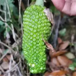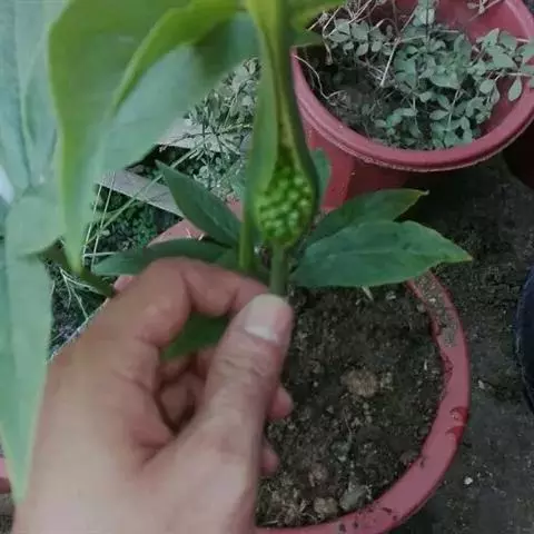 花序柄短于叶柄,长9-15厘米。佛焰苞长约10厘米,管部漏斗状,白绿色,长5厘米,上部粗2厘米,喉部边缘斜截形,狭外,卷;檐部直立,卵状披针形,渐尖,长5-6厘米,宽3-4厘米,绿色或紫色具白色条纹。肉穗花序单性,雄花序长约2厘米,上部渐狭,花疏;雌花序短圆锥形,长1厘米,基部粗5毫米;各附属器具短柄,棒状,长2.5-3.5厘米,基部截形,粗4-5毫米,向上略细,先端钝圆,粗约2毫米。雄花具柄,花药2-3,药室近圆球形,顶孔圆形;雌花:子房倒卵形,柱头大,盘状,具短柄。浆果红色,直径5-9毫米;种子4,红色,卵形。肉穗花序轴常于果期增大,基部粗可达2.8厘米,果落后紫红色。花期5月,果9月成熟。