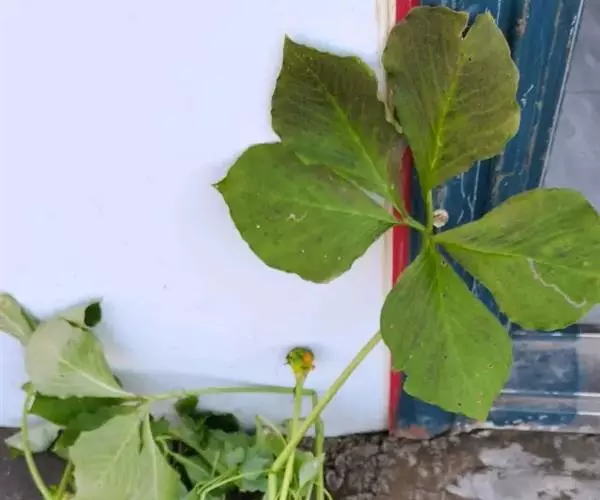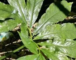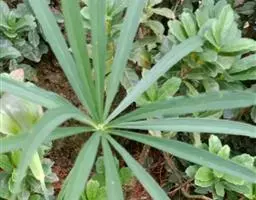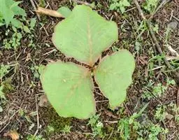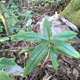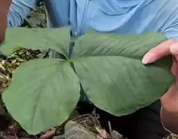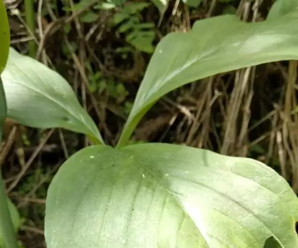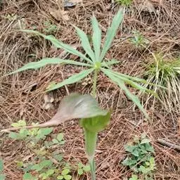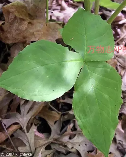 块茎小,近球形,直径1-2厘米。鳞叶2,线状披针形,锐尖,膜质,内面的长9-15厘米。叶1,叶柄长17-30厘米,下部1/3具鞘,紫色;叶片鸟足状分裂,裂片5,倒卵形,倒卵状披针形或椭圆形,先端短渐尖或锐尖,基部楔形,中裂片具长0.2-2厘米的柄,??7-11厘米,宽4-7厘米,侧裂片具长0.5-1厘米共同的柄,与中裂片近等大;侧脉脉距0.8-1.2厘米,集合脉距边缘3-6毫米,全缘。
