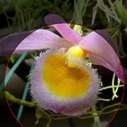 花瓣斜宽卵形,长2.6-3.5厘米,宽1.7-2.3厘米,先端钝,具7条脉;唇瓣圆形,边缘内卷而形成杓状,长2.4厘米,宽约2.2厘米,上面密被短柔毛,下面无毛,唇盘基部两侧各具1个浅紫褐色的斑块;蕊柱黄色,长约4毫米,具长约4毫米的蕊柱足;药帽紫色,圆锥形,上面光滑,前端边缘具不整齐的细齿。花期4-6月。