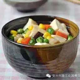 豆腐,古称“福黎”,是由我国最早发明、制造,而后传往世界各地的。豆腐是我国素食菜肴的主要原料,历来受到人们的欢迎,被人们誉为“植物肉”。豆腐主要以大豆为原料加工制成的,大豆含有较多的蛋白质和脂肪,因此豆腐营养价值也较高。豆腐可以常年生产,不受季节限制,因此在蔬菜生产淡季,可以调剂菜肴品种。豆腐有南和北豆腐之分。主要区别在点石膏(或点卤)的多少,南豆腐用石膏较少,因而质地细嫩,水分含量在90%左右;北豆腐用石膏较多,质地较南豆腐老,水分含量在85-88%。豆腐是中国的传统 文思豆腐 食品,味美而养生。