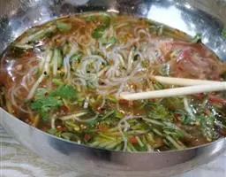 臊子面 选铁锅最好,注清水,旺火沸腾,放入肉臊子,再让水沸腾。后将准备的木耳、鸡蛋、黄花菜、底菜入锅,并根据需要再行调味,旺火滚沸后文火热之,加漂菜。汤要注意色正,即红、鲜、亮。汤味也可根据口味微调,但要保持酸、辣、鲜基本口味,汤成。将热汤浇到刚出锅的面上即成一碗汤滑味鲜、香美可口的臊子面。配汤是臊子面的关键所在,所谓一碗面,七分汤,汤很重要。