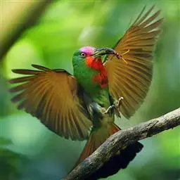 南红蜂虎中等大小,嘴形细长而下弯,先端尖,嘴峰有棱脊;脚细弱,中趾与外趾至少连结至基部第二个关节,与内趾则仅于基部的第一个关节并连;初级飞羽10片;尾羽12片;翅膀长度适中,腿短,有些种类尾部有飘带。羽色艳丽,两性相似,幼鸟似成鸟。生活于村庄附近丘陵林地;树栖性;以空中飞虫为食,特别喜吃蜂类;在山地土壁挖隧道为巢;卵形颇圆,白色。该科鸟类遍布旧大陆的热带和温带区域。