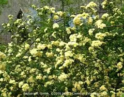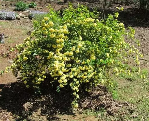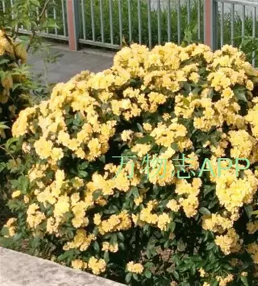 黄木香花 攀援小灌木,高可达6米;小枝圆柱形,无毛,有短小皮刺;老枝上的皮刺较大,坚硬,经栽培后有时枝条无刺。小叶3-5,稀7,连叶柄长4-6厘米;小叶片椭圆状卵形或长圆披针形,长2-5厘米,宽8-18毫米,先端急尖或稍钝,基部近圆形或宽楔形,边缘有紧贴细锯齿,上面无毛,深绿色,下面淡绿色,中脉突起,沿脉有柔毛;小叶柄和叶轴有稀疏柔毛和散生小皮刺;托叶线状披针形,膜质,离生,早落。花小形,多朵成伞形花序,花直径1.5-2.5厘米;花梗长2-3厘米,无毛;萼片卵形,先端长渐尖,全缘,萼筒和萼片外面均无毛,内面被白色柔毛;花黄色重瓣,倒卵形,先端圆,基部楔形;心皮多数,花柱离生,密被柔毛,比雄蕊短很多。花期4-5月。