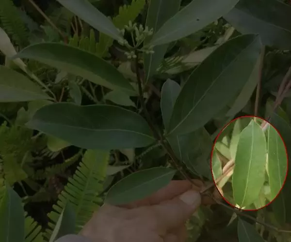 常绿乔木,高约15米,叶、枝及树皮干时几不具芳香气。枝条及小枝褐色,圆柱形,无毛。叶对生或近对生,卵圆形至长圆状卵圆形,长8-11(14)厘米,宽4-5.5(9)厘米,先端锐尖,基部圆形,革质,上面鲜时绿色,干时灰绿色,光亮,下面近同色,晦暗,两面无毛,具离基三出脉,侧脉自叶基约1厘米处生出,近叶片3/4处渐消失或不明显网结,有时近叶缘一侧各有一条附加的侧脉,细脉两面明显,呈浅蜂巢状网结;叶柄长约1.5厘米,腹凹背凸,红褐色或褐色。