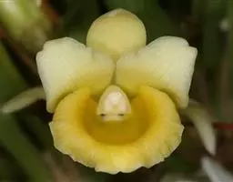 总状花序出自具叶的茎端,具1-2朵花;花序柄长5-10毫米,基部被3-4枚短的鞘;花苞片纸质,卵形,长约5毫米,先端急尖;花开展,萼片和花瓣淡黄色或白色,相似,近等大,狭卵状长圆形,长2.5-3.4厘米,宽6-9毫米,先端渐尖,具5条脉;中萼片的中肋在背面具矮的狭翅;侧萼片与中萼片近等大,但基部歪斜,具5条脉,在背面的中肋具矮的狭翅;萼囊劲直,角状,长1.5-2厘米。