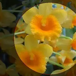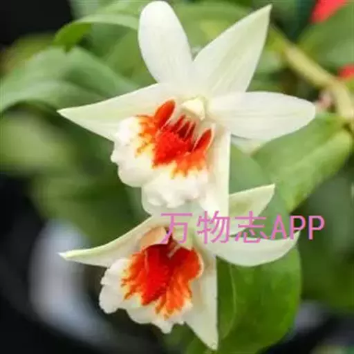 唇瓣淡黄色或白色,带橘红色的唇盘,长约2.5厘米,3裂;侧裂片围抱蕊柱,近倒卵形,前端边缘稍波状;中裂片近圆形或宽椭圆形,先端锐尖,边缘波状;唇盘沿脉纹疏生粗短的流苏;蕊柱长约6毫米;药帽短圆锥形,前端边缘密生短髯毛。花期4-5月。